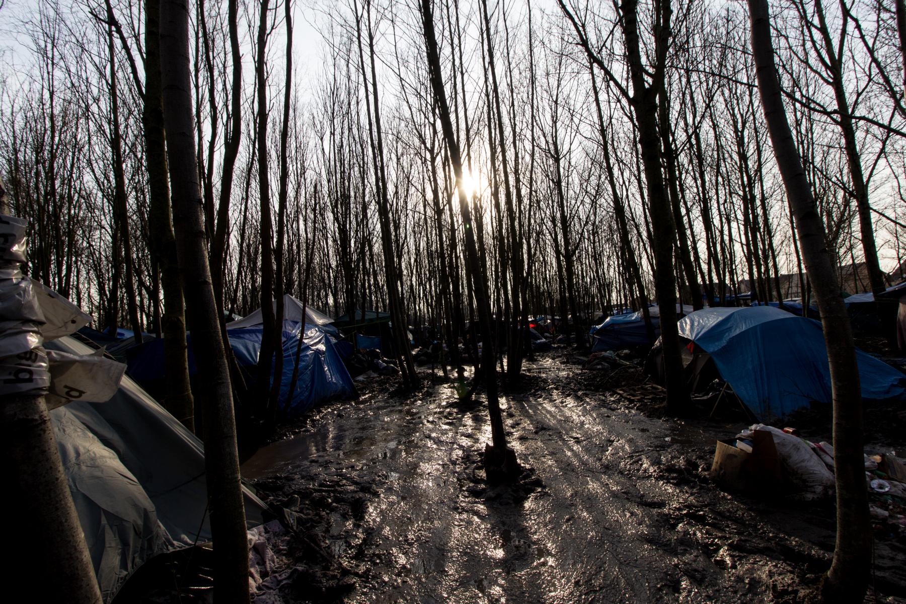 Ein Februarmorgen. Kalt und sternenklar war die Nacht im Camp, gelegen zwischen Reihenhaussiedlung, Decathlon und hochmodernem Fussballstadion. Nun scheint die Sonne über den Zelten im Flüchtlingscamp von Dünkirchen, eine leichte Brise Wind weht von der Nordsee herüber. Auf der matschigen Hauptstraße, die den Namen „Queen Elisabeth Street“ trägt, ist schon viel los. Kleine Kinder rennen durch die Pfützen. Auffällig sind all Menschen, die mit ihren Schlafsäcken in den Händen in das Camp zurückkehren. Ihre Gesichter sind traurig. Sie alle haben es nicht geschafft nach England, ins vermeintliche Paradies. Viele haben schon dutzende Fluchtversuche hinter sich, im oder unter einem Lastwagen über die Fähre nach Dover zu kommen. Doch Spürhunde haben sie gefunden, die Polizei hat sie verhaftet und wieder laufen lassen. Nun sind sie wieder da, im Dschungel von Dünkirchen.
