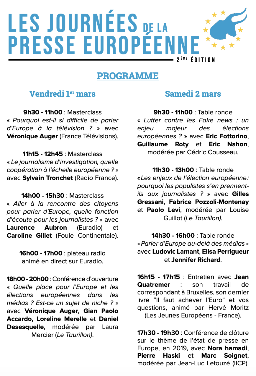 C’est avec la volonté de mobiliser les rédactions et leurs journalistes que Le Taurillon organise sa deuxième édition des Journées de la presse européenne, les 1er et 2 mars 2019. Nous nous sommes entourés de partenaires engagés dans cette démarche d’information et de développement du journalisme européen, avec l’IICP, école hôte de l’événement, ainsi que l’Association des Journalistes Européens, Euractiv France et Euradio.