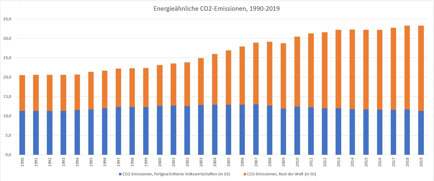 Entwicklung der globalen CO2-Emissionen im Überblick. Datenquelle: International Energy Agency